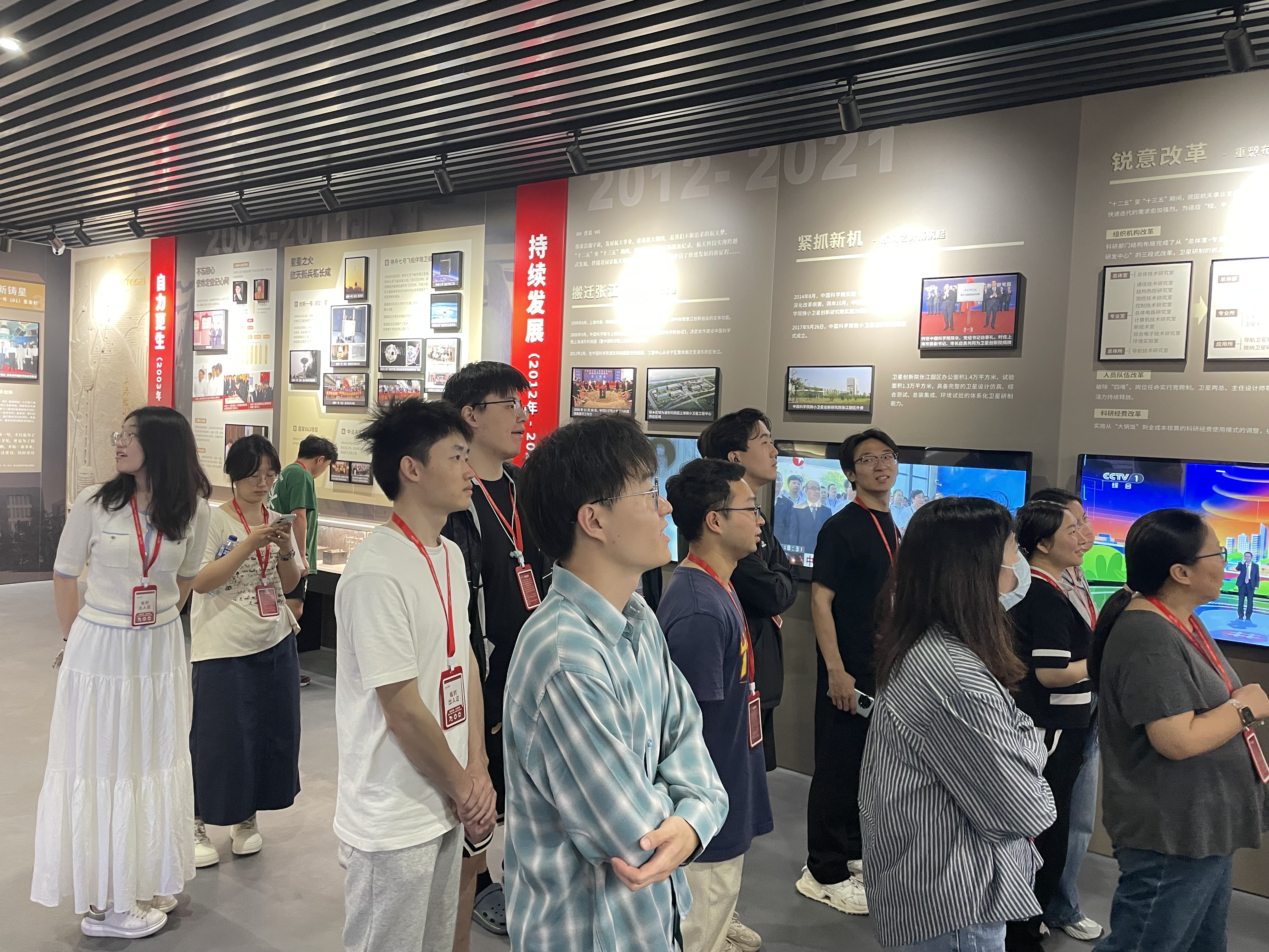 師生們首先參觀了衛星創新院航天衛星科普教育基地(院史館),通過圖文展板、衛星模型和發射模擬視頻等形式,系統地了解了研究院20年來的發展歷程及其在北斗導航、量子通信、暗物質探測等領域取得的代表性科研成果。隨后,師生們進入衛星研發總裝廠房,近距離接觸到包括“天宮二號”伴星、“悟空號”等衛星模型,深刻體會到航天工作者們身上的“三無精神”(無名英雄、無私奉獻、無上光榮)與家國情懷。通過此次主題教育活動,師生們不僅收獲了豐富的航天知識,更體會到了科學家們“特別能吃苦、特別能戰斗、特別能攻關、特別能奉獻”的精神。
