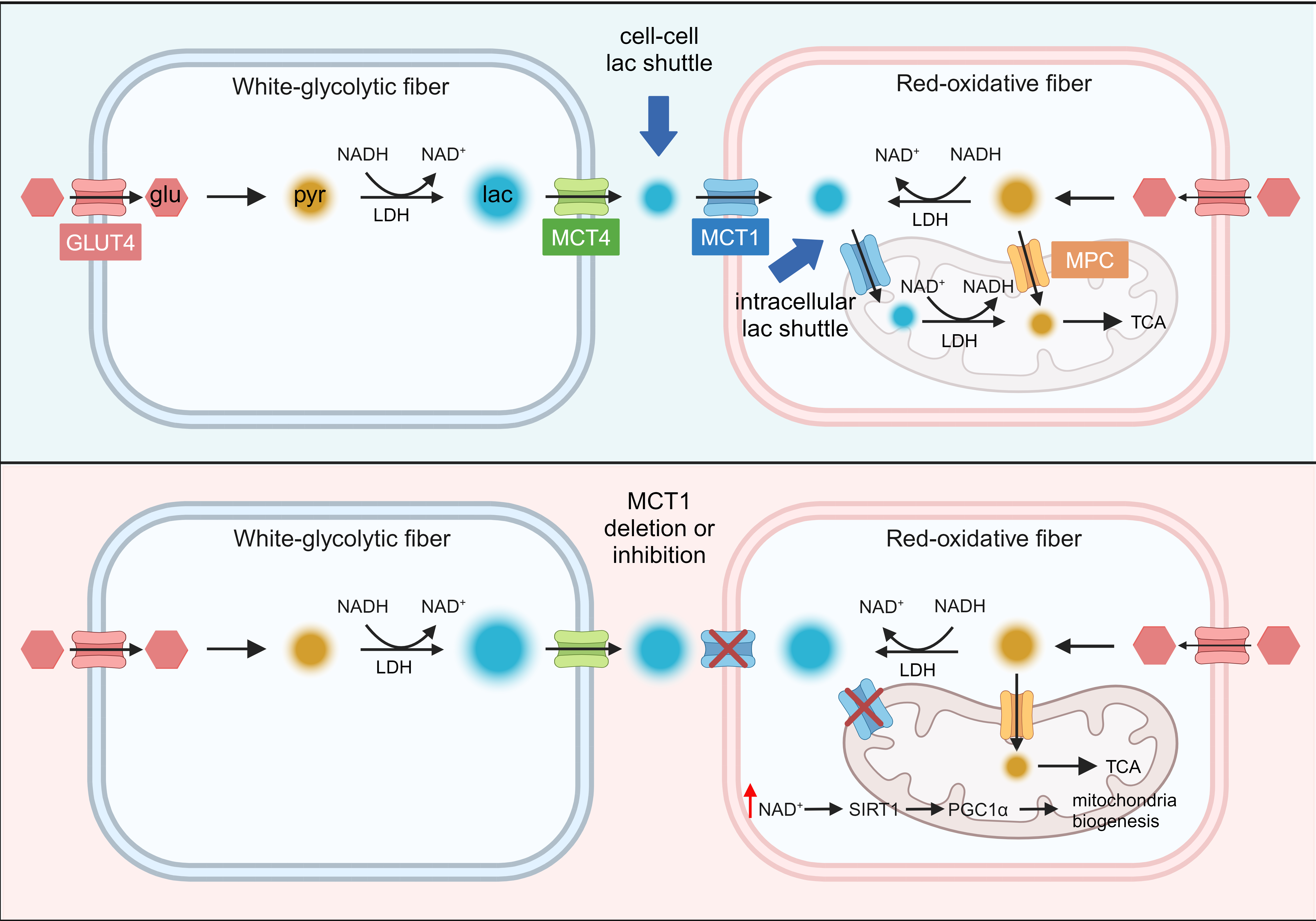 研究人員首先通過免疫熒光觀察到骨骼肌肌纖維的單羧酸轉運體MCT1和MCT4存在特異性分布,這一結果提示了肌纖維細胞之間可能存在著依賴于MCT1和MCT4的“乳酸穿梭”現(xiàn)象。由于MCT1在骨骼肌中的表達遠高于MCT4,研究人員通過構建骨骼肌特異敲除MCT1的動物模型(mKO),對骨骼肌肌纖維中MCT1介導的乳酸代謝進行進一步探究。結果表明,mKO小鼠表現(xiàn)出更好的運動耐力,氧化型肌纖維比例顯著增加,而糖酵解型肌纖維比例則顯著減少。在代謝層面,研究人員通過代謝流技術及代謝組學,結合多種動物學實驗發(fā)現(xiàn)mKO小鼠糖耐量改善,代謝率提高,骨骼肌三羧酸循環(huán)對于葡萄糖的利用增加。在機制探究層面,研究人員提出了乳酸在骨骼肌肌纖維中的轉運依賴兩個“穿梭”途徑的觀點,即肌纖維“細胞間的乳酸穿梭”以及氧化型肌纖維“細胞內的乳酸穿梭”,并通過MCT1骨骼肌的特異敲除對此觀點加以驗證。正常肌纖維細胞間的乳酸轉運依賴MCT1和MCT4的共同參與,乳酸由糖酵解型的肌纖維細胞產生,經MCT4轉運體轉運出胞外,再通過氧化型肌纖維上的MCT1轉運體攝取乳酸進入胞內。在氧化型肌纖維胞內,線粒體同樣通過MCT1將乳酸攝取進入線粒體,再經線粒體LDH作用消耗等摩爾量的NAD+,將乳酸轉化成丙酮酸進入三羧酸循環(huán)。而在骨骼肌MCT1功能缺失的情況下,乳酸進入氧化型肌纖維及進入線粒體的過程同時受阻,胞內NAD+水平增加,依賴NAD+的去乙酰化酶SIRT1活性增加,PGC-1α的去乙酰化水平及其活性相應增加,因而促進了氧化型肌纖維的產生,提高了線粒體的生物合成過程及其生物活性和功能,最終帶來一系列肌肉功能的改變。
