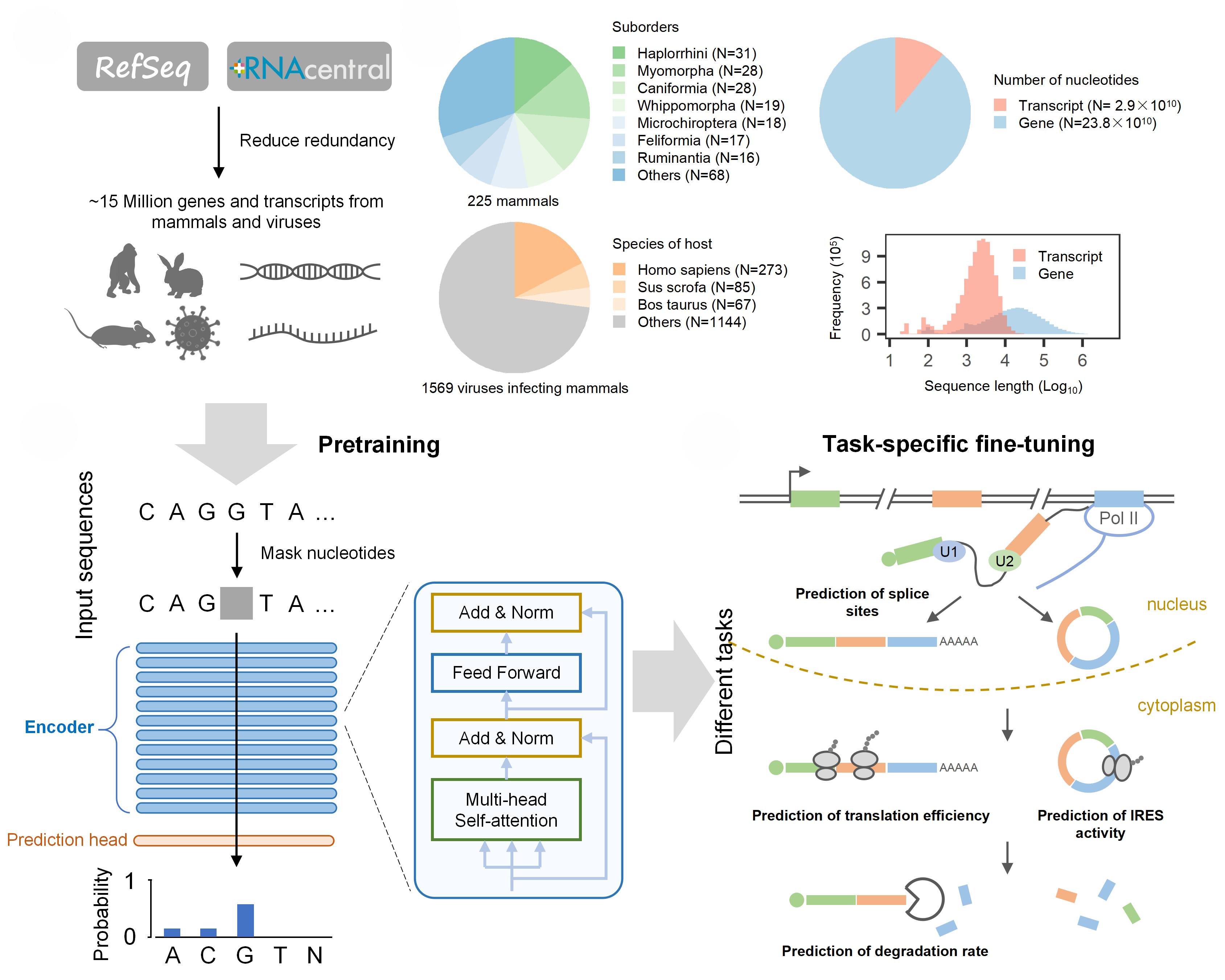 圖1:LAMAR模型架構及研究流程圖:模型首先使用大量基因和轉錄本序列進行無監督預訓練,再使用含有標簽的數據集進行微調解決RNA調控下游任務。